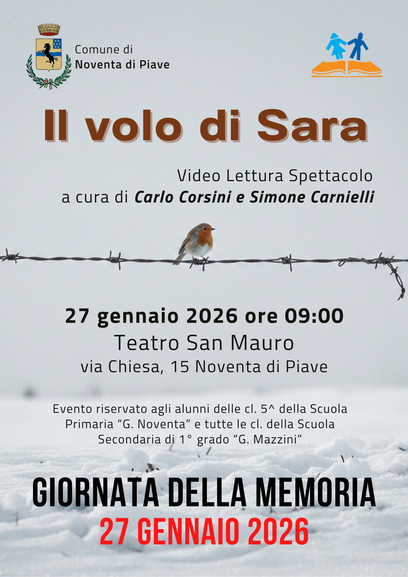 Partendo dal libro Il volo di Sara, durante l’incontro Carlo Corsini e Simone Carnielli proporranno alle alunne e agli alunni presenti diverse storie, che li guideranno nella comprensione della tragedia della Shoah, mettendo in luce al tempo stesso la forza, il coraggio e il desiderio di vita di chi l’ha vissuta. Libri intensi e dolorosi, capaci però di rivelare, in ogni pagina, la volontà di non arrendersi e la meraviglia della speranza.