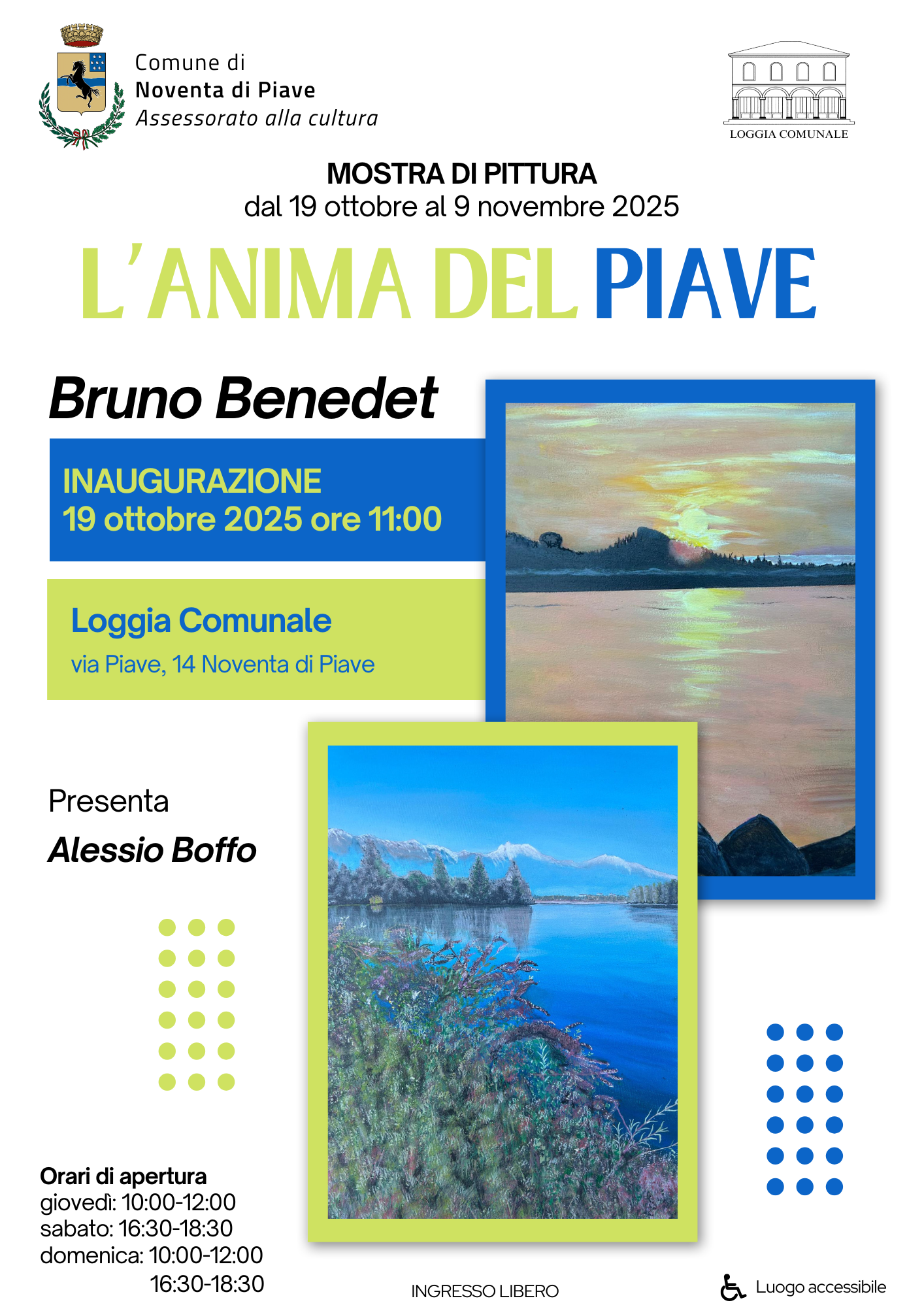 Nell’ambito delle attività espositive nella Loggia Comunale, domenica 19 ottobre 2025 alle ore 11:00 si terrà l’inaugurazione della mostra di pittura di Bruno Benedet, dal titolo “L’anima del Piave”.
