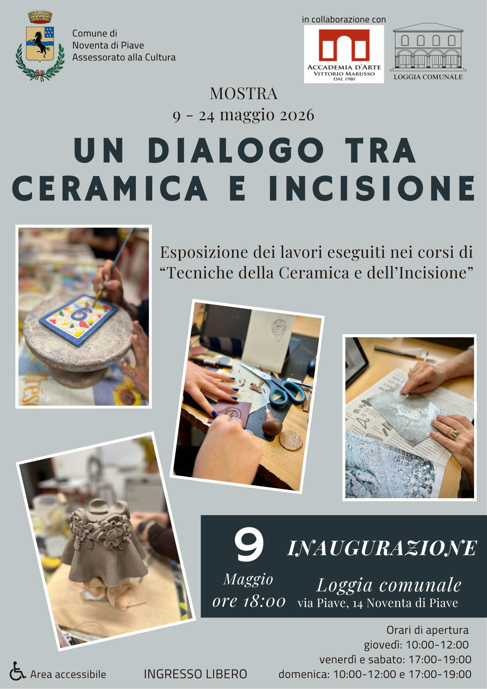 Nell’ambito delle attività espositive ospitate presso la Loggia comunale di Noventa di Piave, dal 9 al 24 maggio 2026 sarà protagonista l’Accademia d’Arte “Vittorio Marusso” di San Donà di Piave con la mostra “Un dialogo tra ceramica e incisione”.