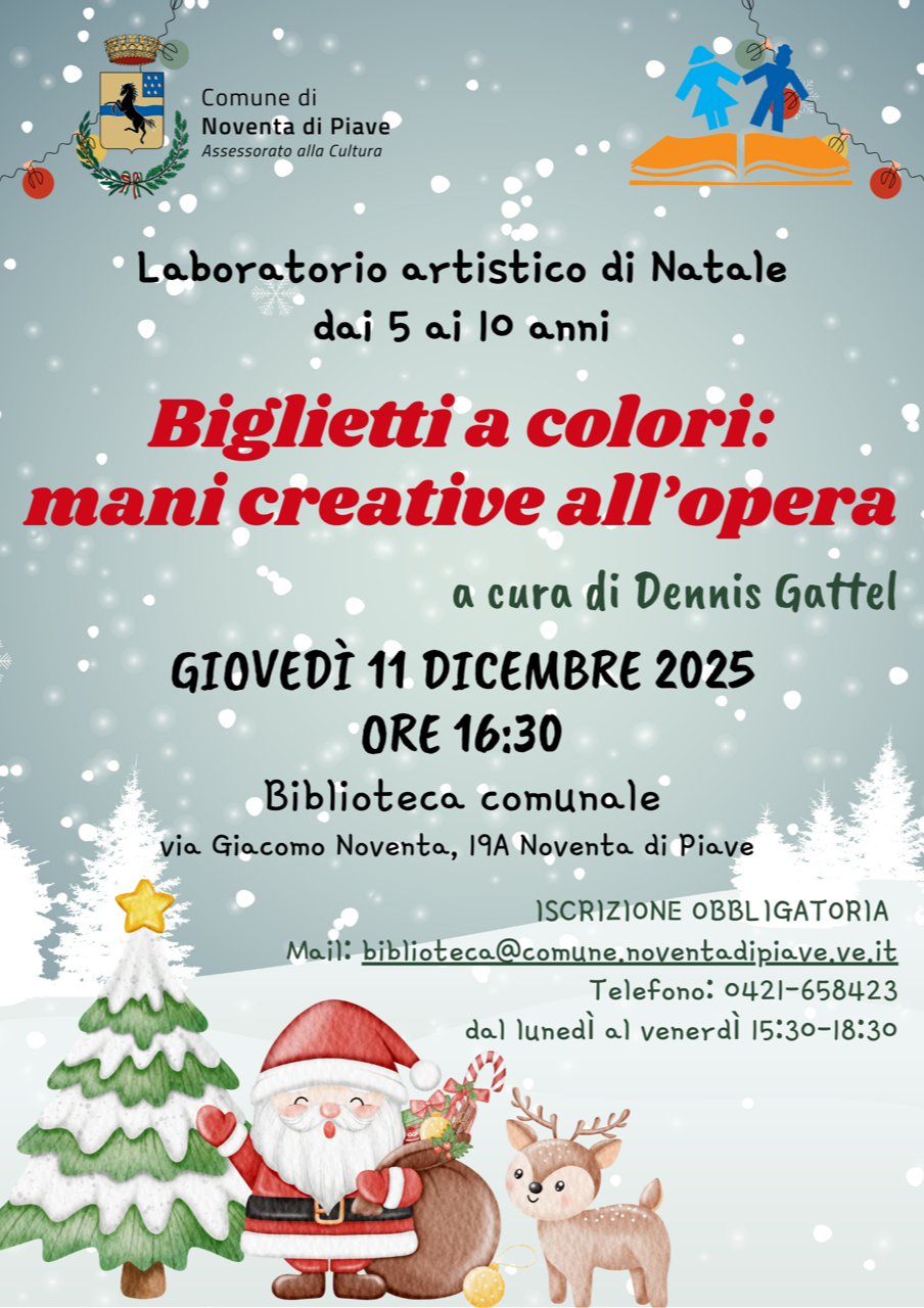 La Biblioteca Comunale propone, in occasione delle festività natalizie, un laboratorio artistico dedicato alla realizzazione di un biglietto d’auguri mediante la tecnica dell’acquerello su carta bagnata. L’esperienza è rivolta agli alunni della scuola primaria “G. Noventa”.