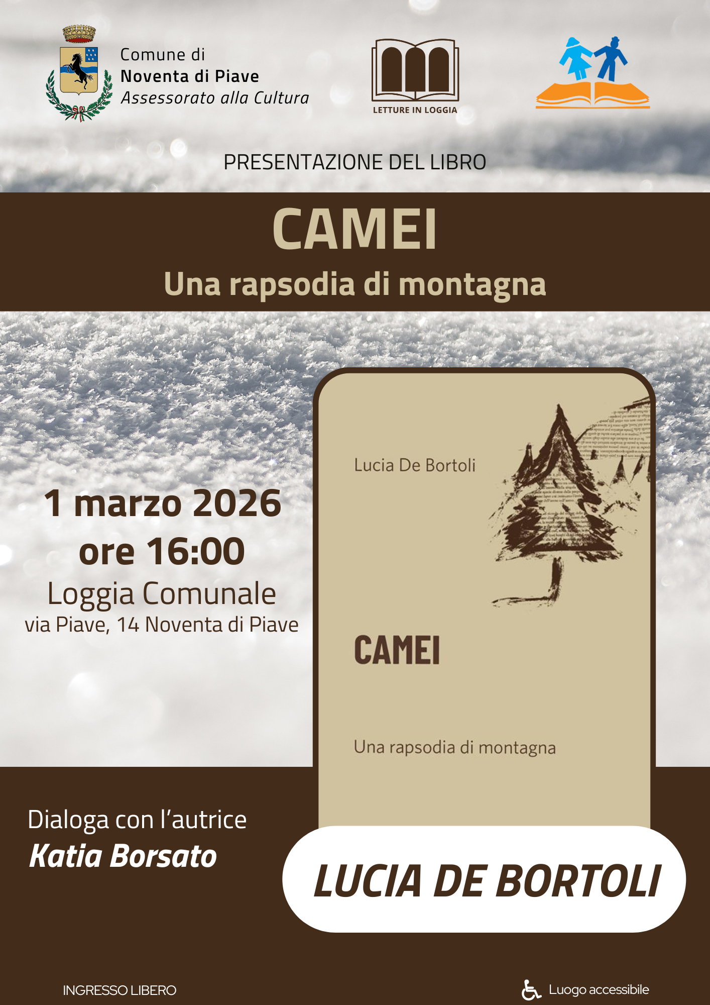 Nella suggestiva cornice della Loggia Comunale si terrà un incontro letterario dedicato alla presentazione del romanzo “CAMEI – Una rapsodia di montagna” di Lucia De Bortoli, pubblicato da NFC Edizioni nel 2025.